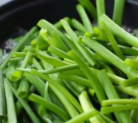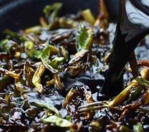 3、用小火煸炒,直到大部分蔥綠都變成幹黃焦黑的程度,然後把調好的料汁倒入鍋中,繼續用小火炒一下,然後關火。