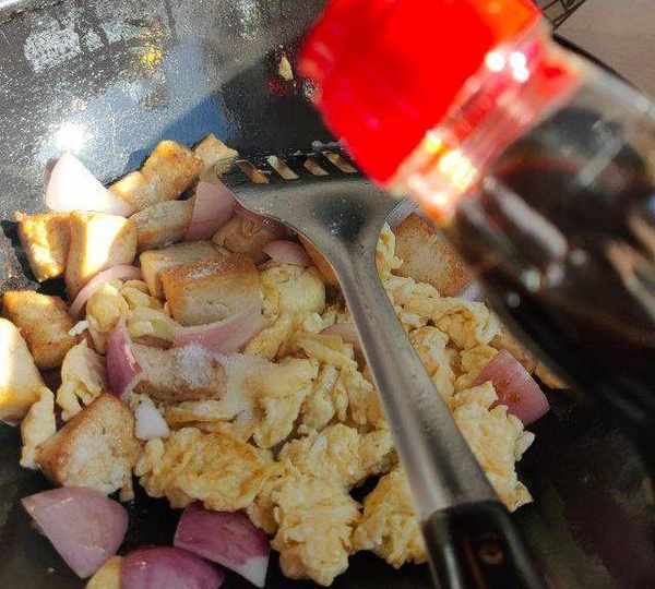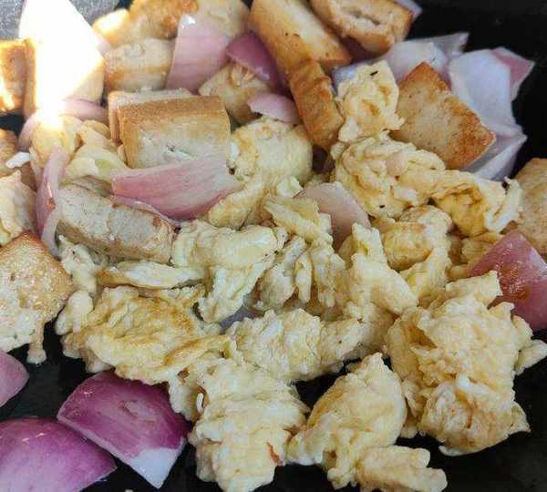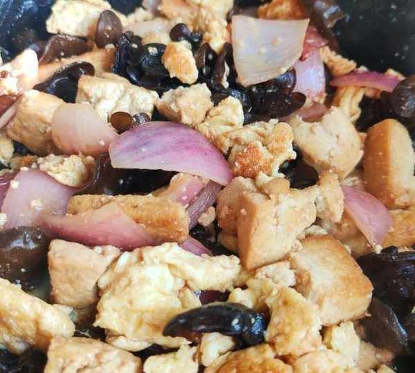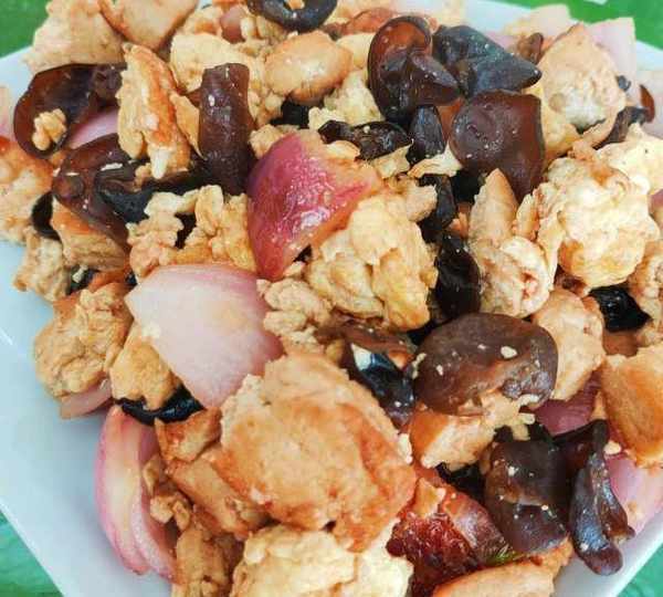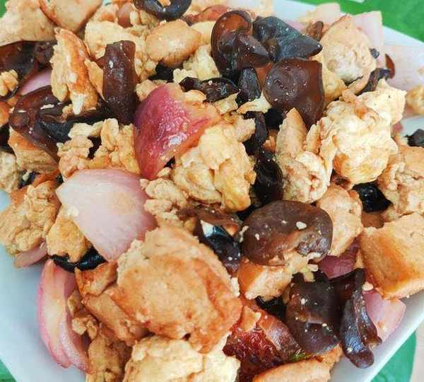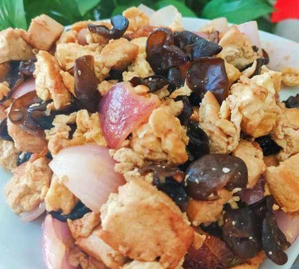 原料:北豆腐、雞蛋、木耳、洋蔥、鹽、白糖、生抽、玉米油、雞精。