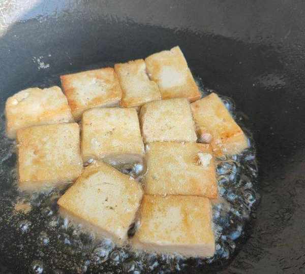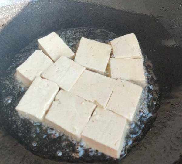 第5步、鍋內放少許油,燒熱後放入豆腐塊。