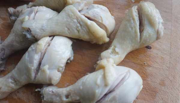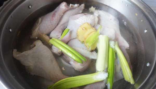 雞腿洗凈涼水下鍋,加蔥薑料酒煮開去血沫。