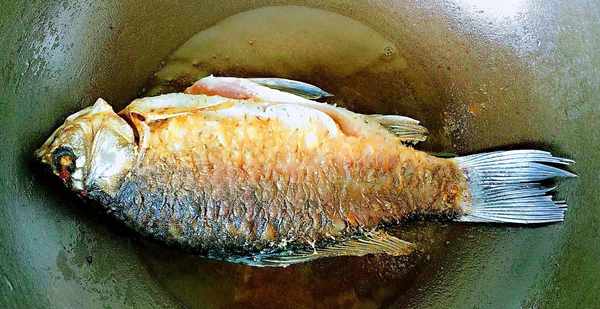 4、炒鍋加熱,放入食用油,油熱後下入裹上幹面粉的魚,小火慢煎;註意,這個時候不要晃動鍋子,大概需要2-3分鐘,魚貼著鍋的一面就煎好瞭,這個時候就可以翻面瞭。同樣的方法,小火慢煎魚的另外一面,還是需要2-3分鐘,兩面都煎至金黃的時候,先把魚盛出來備用。