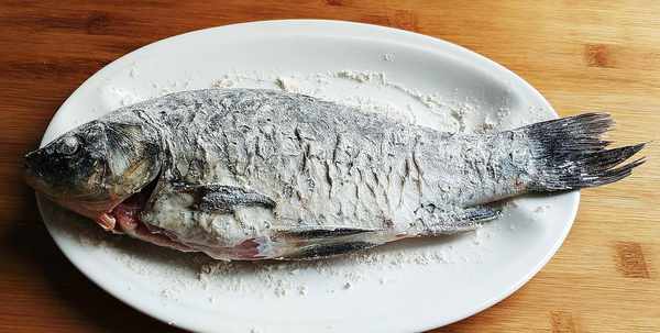 3、用廚房吸油紙把魚身上的水分吸幹,然後給魚身兩面均勻的裹上幹面粉。