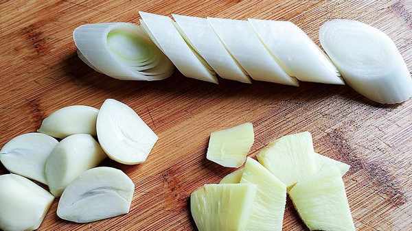 2、準備一些蔥、薑、蒜,清洗幹凈,蔥切段,薑切片(也可以切絲,切片吃的時候更容易挑出來),大蒜從中間切開。