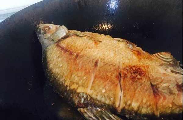 4、熱鍋放油,轉動炒鍋,使鍋底和內壁都被熱油浸潤,油熱後關小火,把魚放入鍋裡煎炸,慢慢晃動油鍋,使魚頭、魚尾都能煎到,然後翻過來煎另一面,待兩面焦黃時,把魚盛出;