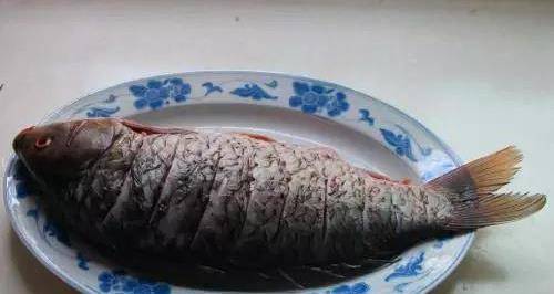 2、在魚身上斜切幾個花刀,用料酒、少許鹽、蔥段、薑片,反復揉搓魚身,然後醃制20分鐘左右;