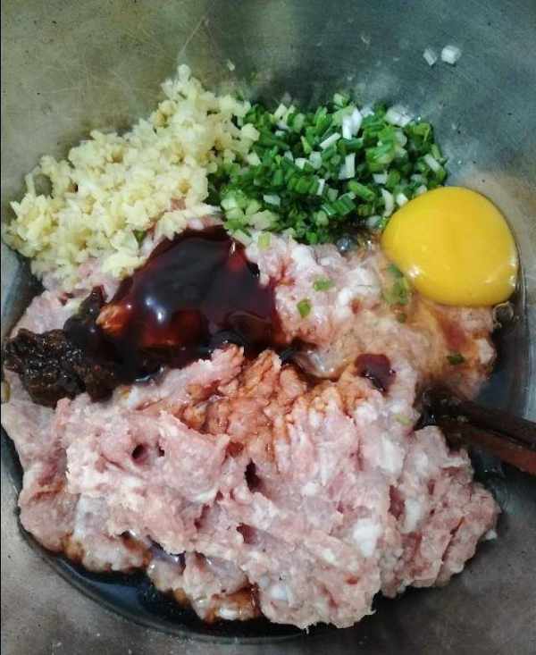 3.剁好的肉糜放入盆中,加料酒、蠔油、蔥末、薑末、雞蛋、黃豆醬、白胡椒粉、麻油,鹽、生抽,少許白糖