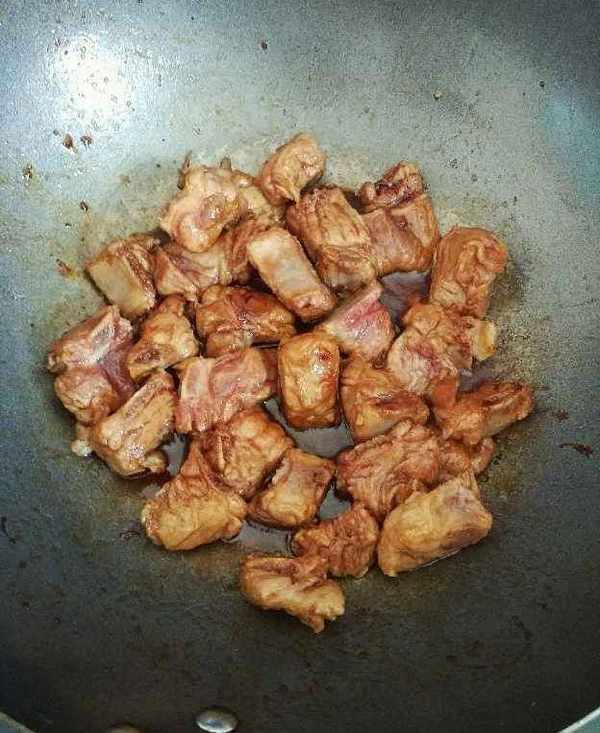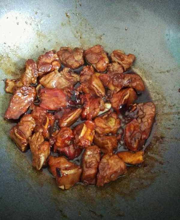 3.放入排骨翻炒均勻上色