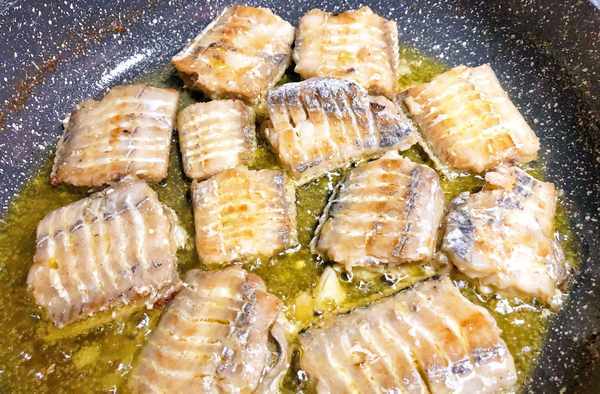 4、起鍋燒油,調小火,這裡可以多放些油,等油溫5成熱後下入帶魚開始煎制,直到把帶魚煎至兩面金黃後即可盛出。