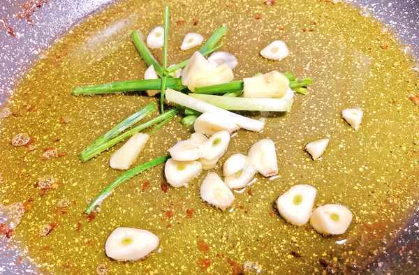 5、重新起鍋燒油,等油熱後下入1根小蔥、3片生薑和3瓣大蒜,煸炒出香味。