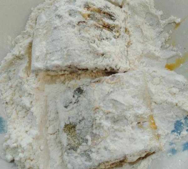 7.裹好雞蛋液的帶魚再均勻地沾上幹淀粉(沾上幹淀粉,煎的時候不會粘鍋)