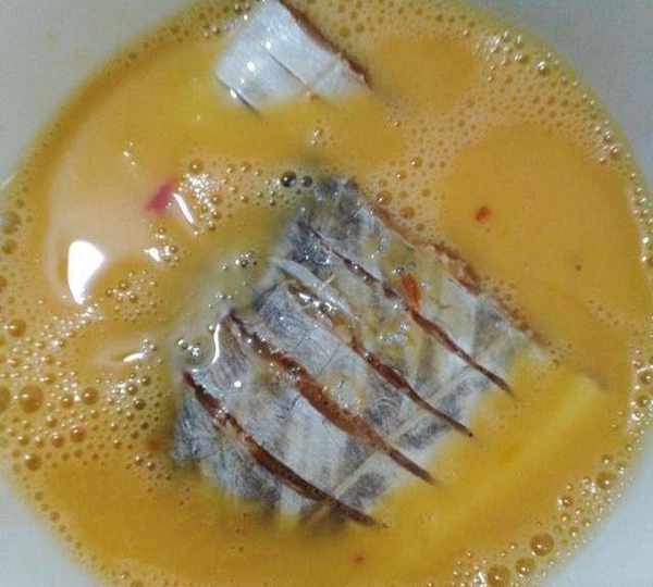 6.將醃制好的帶魚塊在雞蛋液中滾一次(裹一層雞蛋液,魚肉更酥香)