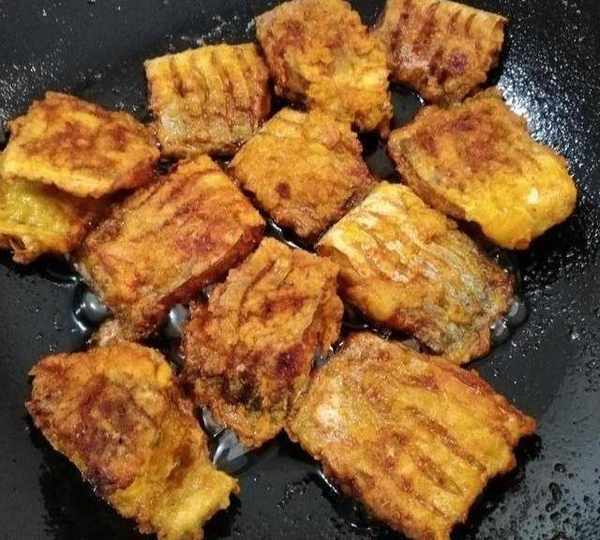 8.每塊帶魚裹好粉之後,鍋中燒油,油熱下帶魚塊,一面煎至金黃後,翻另一面也煎至金黃(必須開小火慢煎,將帶魚煎香,火大瞭,容易煎糊,不會用鏟子翻面,也可以用筷子慢慢翻面,避免燙到自己)