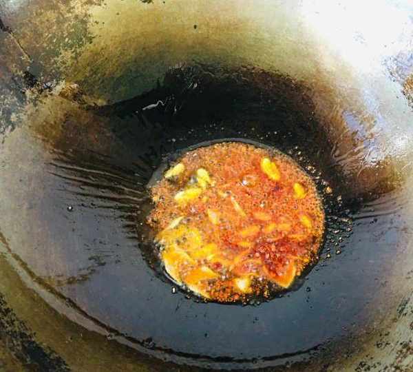 第3步、炒鍋上火放油燒熱,放入蔥花、蒜蓉、辣椒面,炒出紅油。