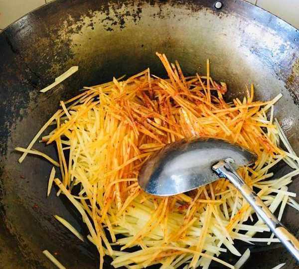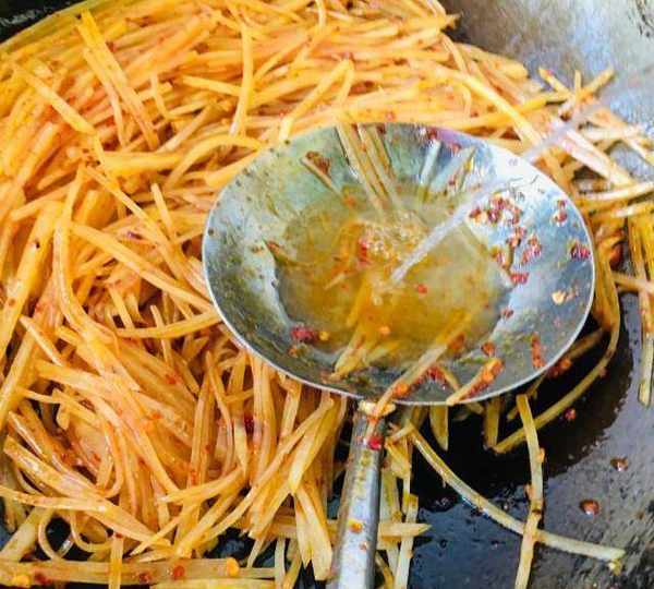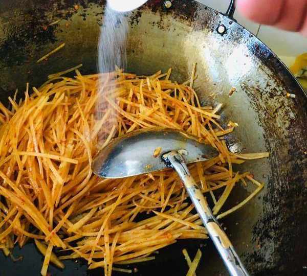 第6步、炒至土豆絲斷生後,放入雞精翻炒均勻,最後烹入白醋。炒勻即可。