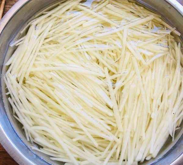 第2步、切好的土豆絲放入清水中,洗去淀粉。濾幹水分備用。