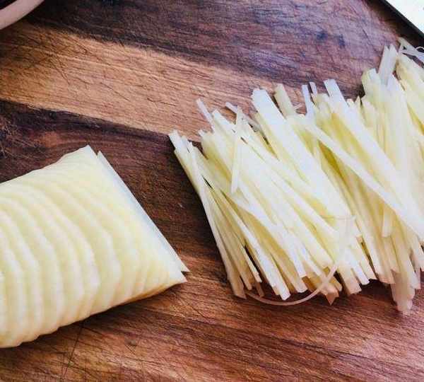 第1步、土豆去皮,切成厚薄均勻的薄片,再切成細如火柴棍的細絲。