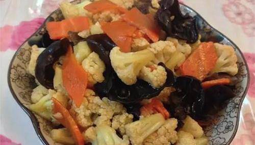 做法:菜花撕成小朵,放到油鹽水中焯水至5成熱。熱油鍋,爆香蒜頭,倒入胡蘿卜片,炒軟。然後加入菜花、黑木耳,翻炒均勻。再加入適量的高湯,翻炒均勻。最後加入少許的清水,蓋上蓋子煮10分鐘。淋上少許的生抽、水淀粉和青蒜,翻炒均勻即可。