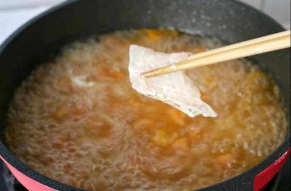 12、湯汁沸騰,把醃好的魚片一片一片下入鍋中汆燙。