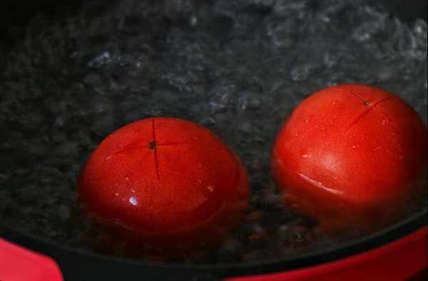 7、兩個西紅柿洗幹凈去掉蒂部並劃上十字刀口,事先燒好熱水淋在上面,熱水一燙就能輕松的剝掉外皮。
