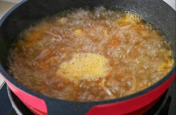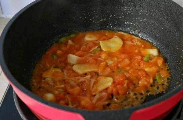 11、西紅柿出沙以後倒入八百到一千毫升的清水,蓋上鍋蓋等待清水燒開。