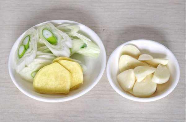 6、蔥薑蒜清洗過後分別去皮,切成薑片、蒜片和蔥段。