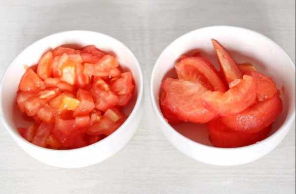 8、一個西紅柿切成碎一點的小塊,另一個切成大塊放在碗中備用。