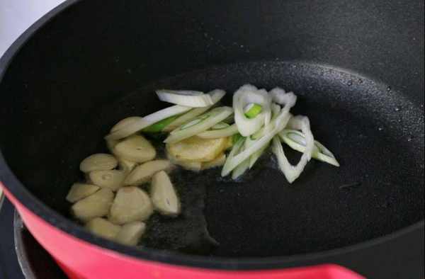 9、拿平底鍋倒入食用油開火加熱,下蔥薑蒜用大火翻炒。