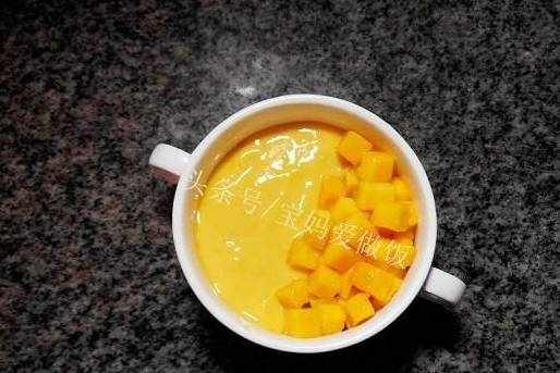 將芒果肉放入碗中一半的位置,另一半位置倒入奶昔。