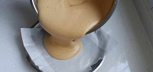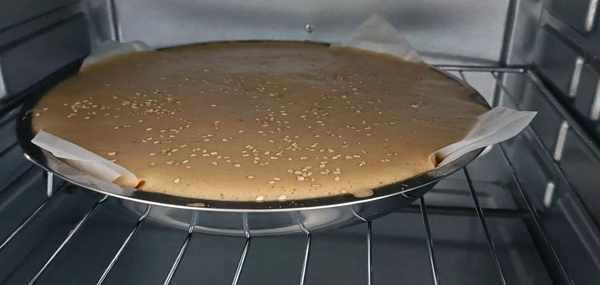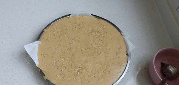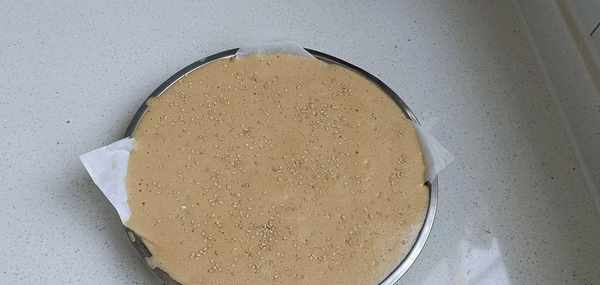 三.準備一個烤盤,烤盤下面鋪上一層油紙,把做好的蛋液,倒入烤盤中,因為蛋液上有氣泡,再捏住烤盤兩邊用手震動幾下,這樣能消除氣泡,再蛋液上面撒上適量白芝麻。