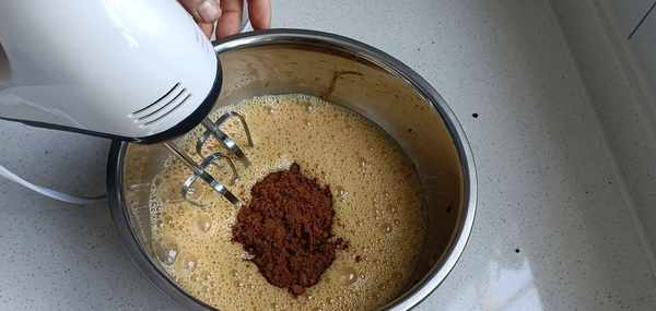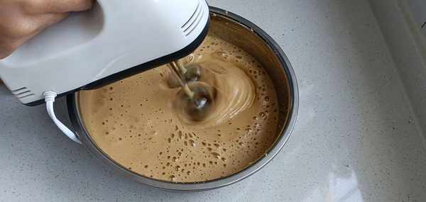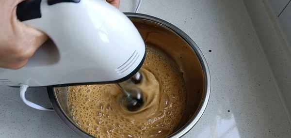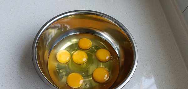 一.首先盆中打入6個雞蛋,再加入50克的紅糖,加入紅糖分兩次加,再用打蛋器進行打發,把蛋液打到有很多氣泡,再把剩下的紅糖放入蛋液中,再次打發,直到把蛋液打到提起打蛋器成倒三角就可以瞭。