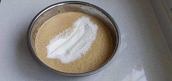 二.打好之後,再加入三克的泡打粉,六十克的普通面粉,再把它們翻拌均勻。