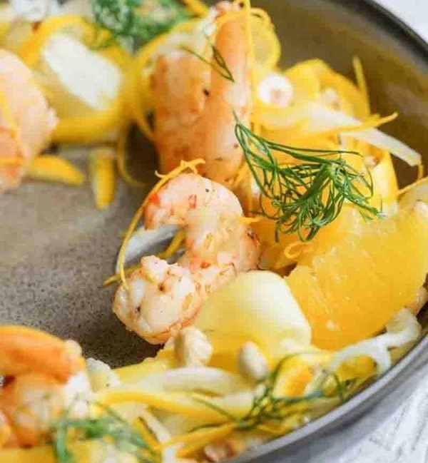 大蝦6隻、茴香頭絲80克 、香橙30克、蒔蘿2克、榛子碎3克、黃節瓜16克、白蘭地3毫升、幹白葡萄酒9毫升