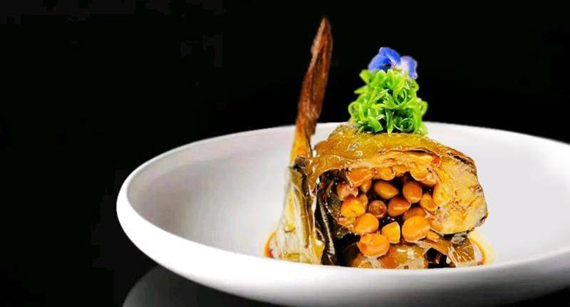 取半張荷葉,鯉魚肚子裡頭塞上花生米,魚肚子朝上,加入陳醋包上即可。