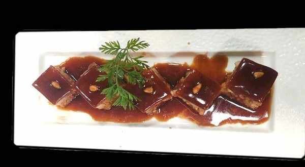 倒入熬好的糖色、黃酒、生抽、水小火燉1.5小時候取出,待晾涼後改刀淋入汁水即可。