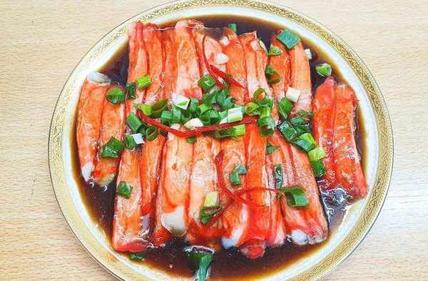 食材:蟹腿肉1盒、青蔥1棵、辣椒1條、蒸魚醬油20毫升