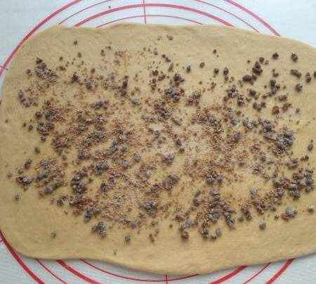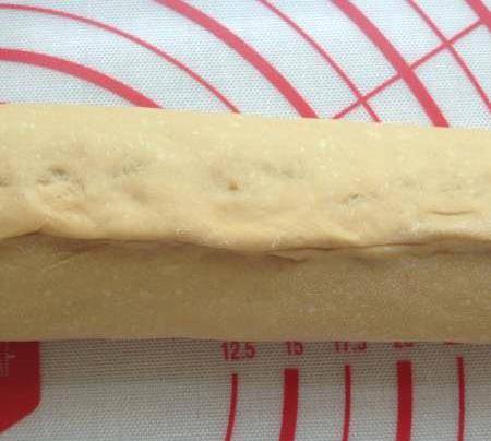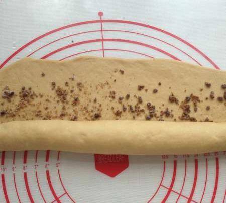 步驟將面團搟成長方形,並在上面均勻的撒上紅糖碎