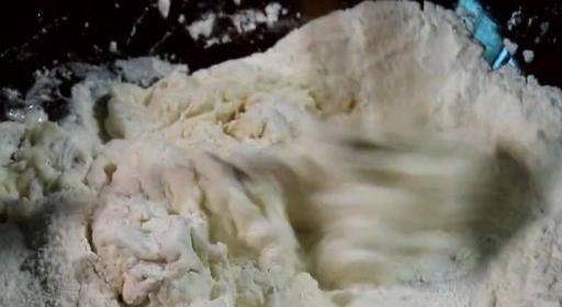加入270克水和成比較軟的面團。邊倒邊用筷子攪,先攪成棉絮狀。
