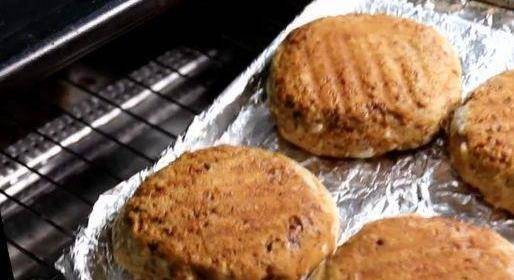 烙至7成熟就可以出鍋瞭。再放進烤盤裡。餅上面刷一層紅糖水。