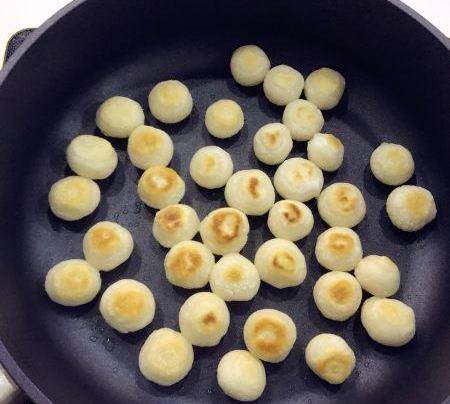 平底鍋中倒入植物油,熱鍋後轉中小火,把湯圓挨個放入,不要黏在一起放哈,煎個2分鐘左右翻面繼續煎2-3分鐘,直至兩邊金黃。》做到這裡就想起之前做烤年糕,超級好吃的說。》煎的時間大傢要根據自己的火力和湯圓大小調整。