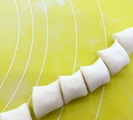 把煮熟的糯米團加入,用手揉成光滑的糯米團,要多點耐心哈,會有點黏手,可以帶手套或手上抹點粉。搓成細條,然後用刀切成差不多大小的小劑子。