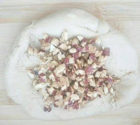 再扒開面團放入紅棗核桃碎揉勻