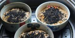 第8步,在小碗中刷上油,把面糊分開倒入碗中,在表面撒上一點黑芝麻,蓋上蓋。