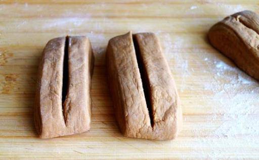 3、拿出面團,搓成長條狀,切成大小一致的小劑子。將他們都整理成長條狀,用都在中間劃上一刀,不要切斷瞭哦。