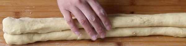 【步驟四】揉成與原來的面團相同大小後,就將它搓成長條,然後分成三份,把每一份都搓圓後正經成長條,三個都搓成長條後,就下面鋪兩條面劑,上面鋪一條面劑,疊成三角形,再整體稍微捏緊,讓它們能夠粘合,不要用手揉。