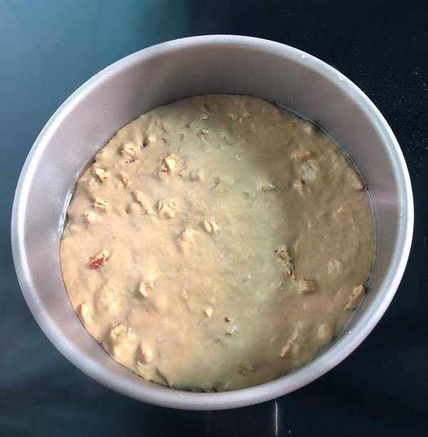 在8寸模具盆裡刷一層薄薄的油,將發好的面倒入模具盆內。