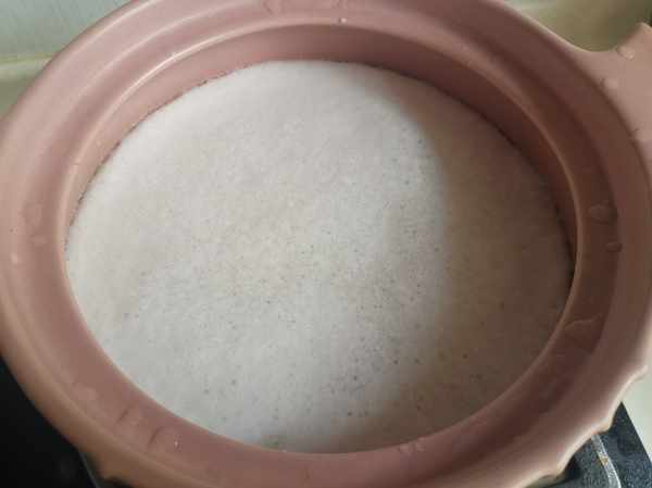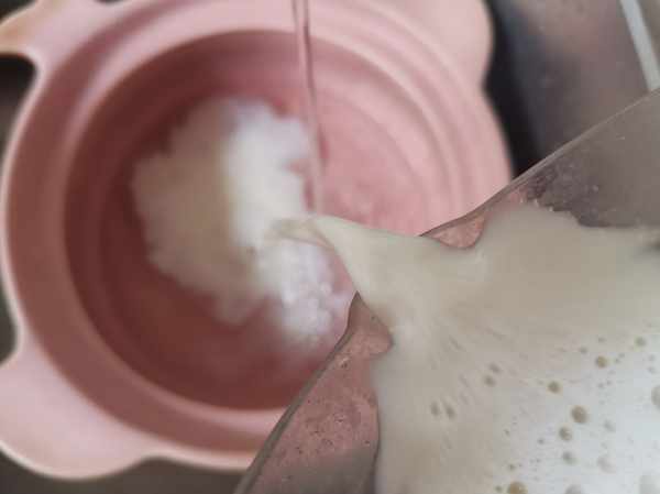 第五步:砂鍋中加入適量的清水,把攪打好的豆汁以及豆渣倒入。