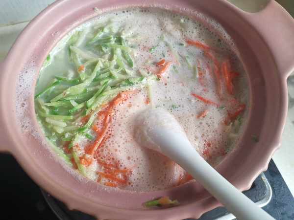 第七步:這時把蘿蔔絲倒入鍋裏,繼續小火慢慢熬煮。