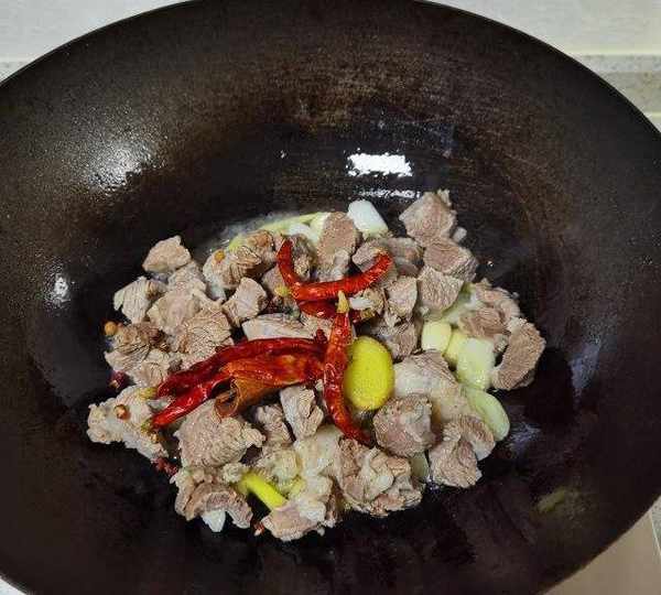 第8步、再把焯過水的羊肉倒進去翻炒均勻,把花椒粒,桂皮和紅辣椒放進去翻炒。