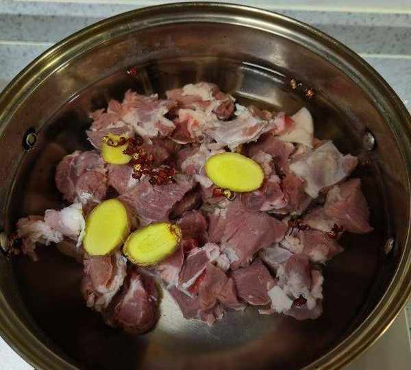 第5步、鍋中倒水,冷水把羊肉塊放進去裡面加生薑,花椒粒把羊肉焯水