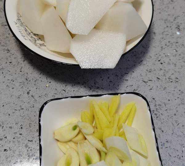 第4步、把蘿卜洗幹凈切成滾刀塊,大蔥切斜角塊,大蒜切片,生薑切絲。